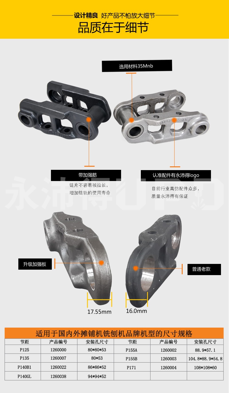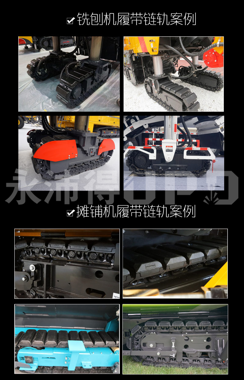 永沛得自主研发生产链轨与徐工、三一、柳工、宏大、柳工、等厂家国内外各系列摊铺机、铣刨机配套
