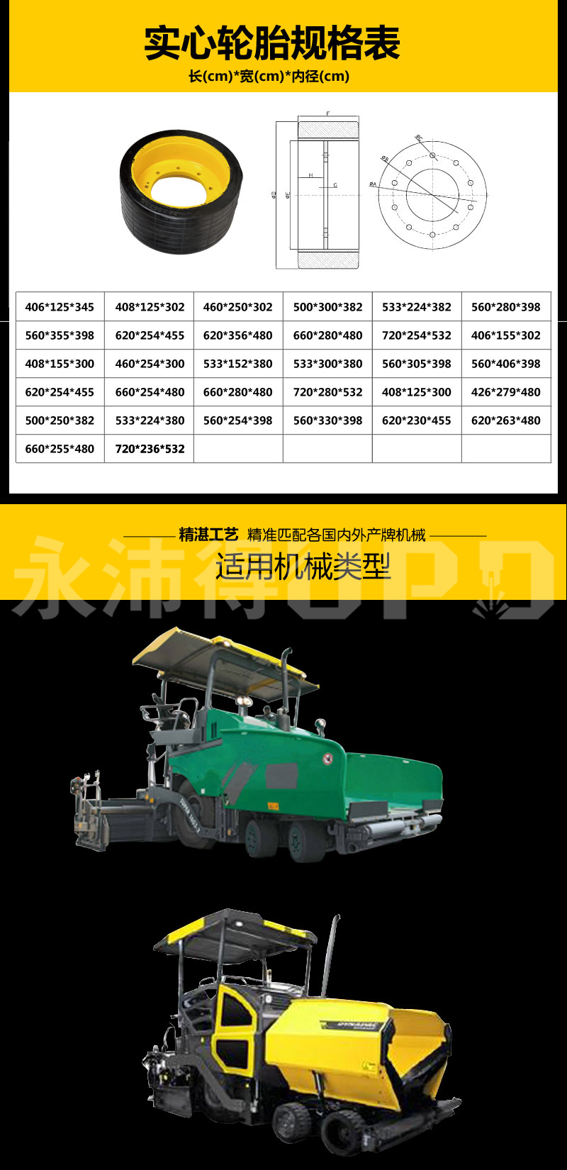 永沛得实心胎适用于铣刨机W100,W100H,W1000F,XG101, XG1003K,华通1米铣刨机,摊铺机:适用于各系列轮式摊铺机,隆声带铣刨鼓五边形实心胎