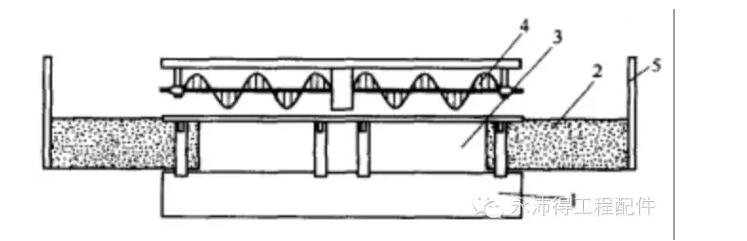 1.偏心轴 2.振动熨平板 3.主振捣梁 4.预振捣梁 5.螺旋摊铺器