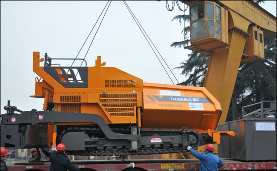 杲杲冬日光,明暖风云平,映衬着华通动力厂区特有的一抹橙黄,WTS105型稳定土摊铺机正在吊装,准备漂洋过海,启程拥抱赞比亚的热带阳光。