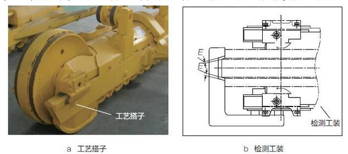 以前,托链轮轴向调整时没有较准确的检测基准,仅靠小的工艺搭子进行定位,定位效果不理想。所以需采取加大工艺搭子的方法增加接触面积,为托链轮的定位提供更准确的基准。托链轮检测、装配时采用与引导轮检测、装配相同的方法,以工艺搭子作基准,用工装进行检测后对其加以调整。