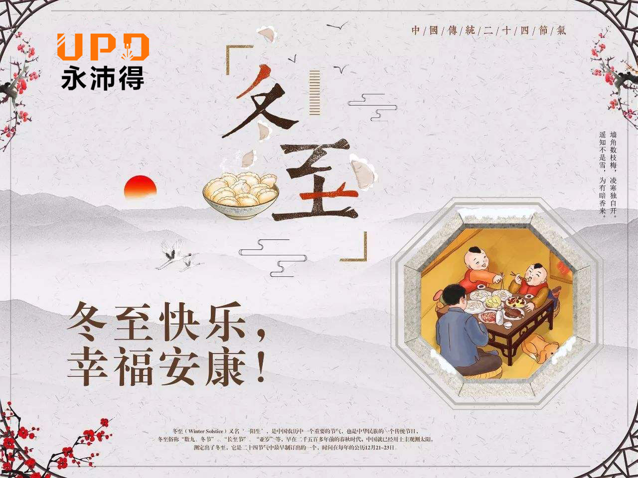 冬至(二十四节气之一)又称日短至、冬节、亚岁等,是四时八节之一,被视为冬季的大节日,在古代民间有“冬至大如年”的讲法。在中国南方地区,有冬至祭祖、宴饮的习俗。在中国北方地区,每年冬至日有吃饺子的习俗。冬至日是北半秋各地白昼时间最短、黑夜最长的一天,时至冬至,标志着即将进入寒冷时节,民间由此开始“数九”计算寒天…